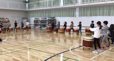 19台の和太鼓をフル活用し、全校児童オールメンバーによる創作曲ができました。
